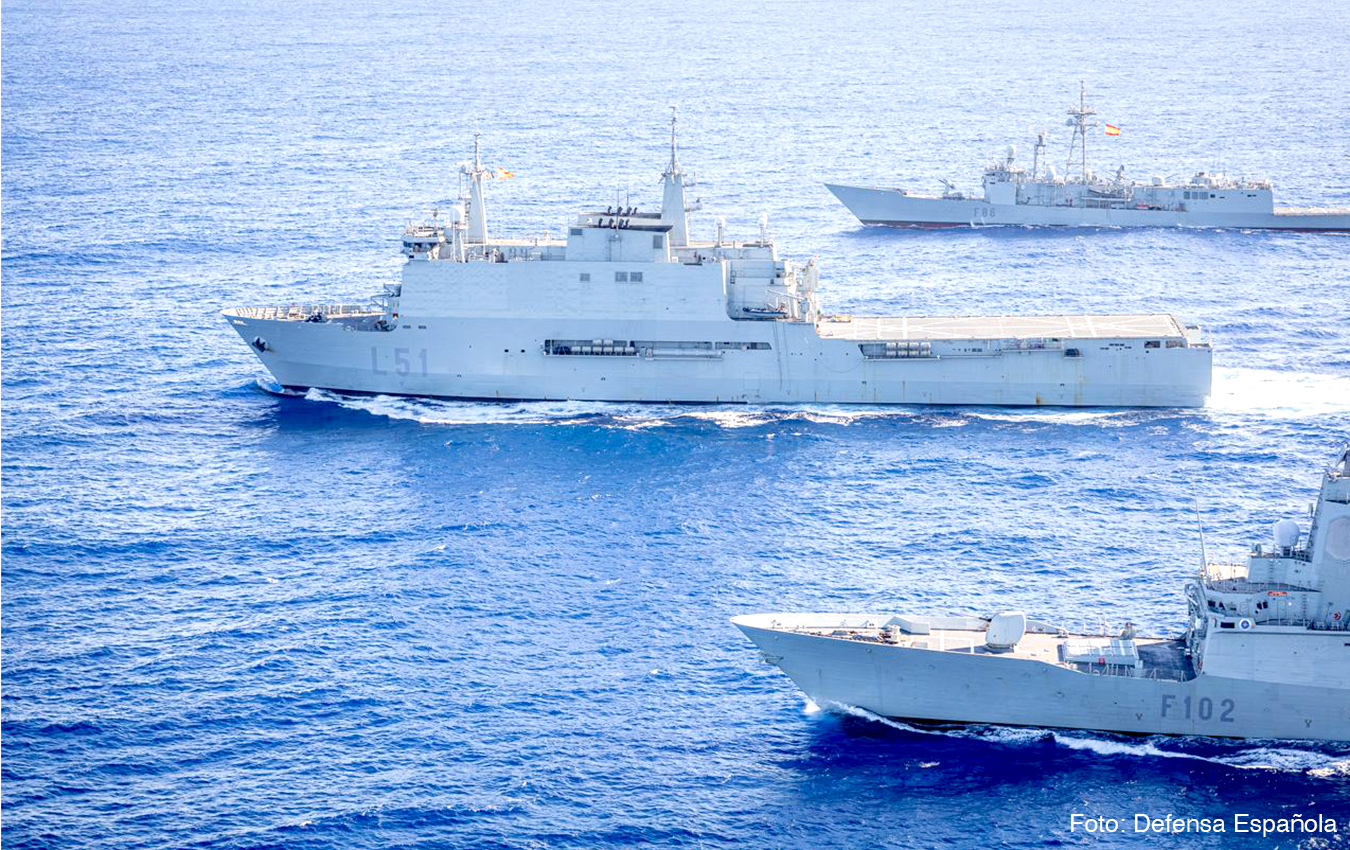 El buque de asalto anfibio Galicia (L-51) actúa como buque de mando, acompañado por la fragata Almirante Juan de Borbón (F-102), la fragata Canarias (F-86) y el buque de aprovisionamiento en combate Cantabria (A-15).